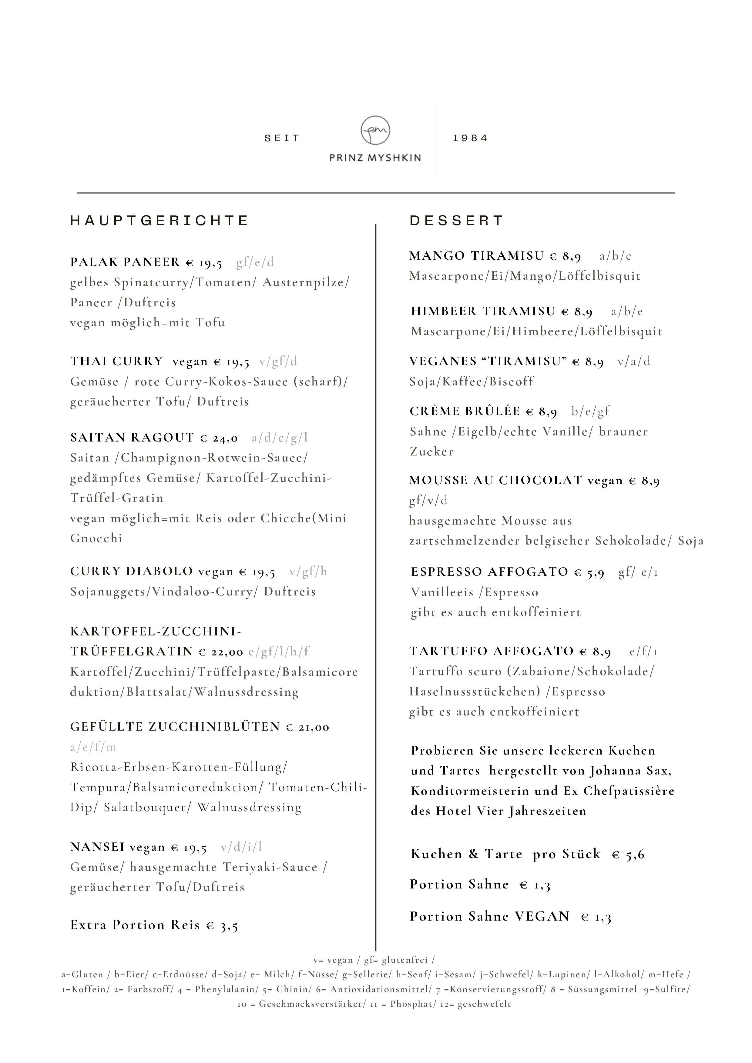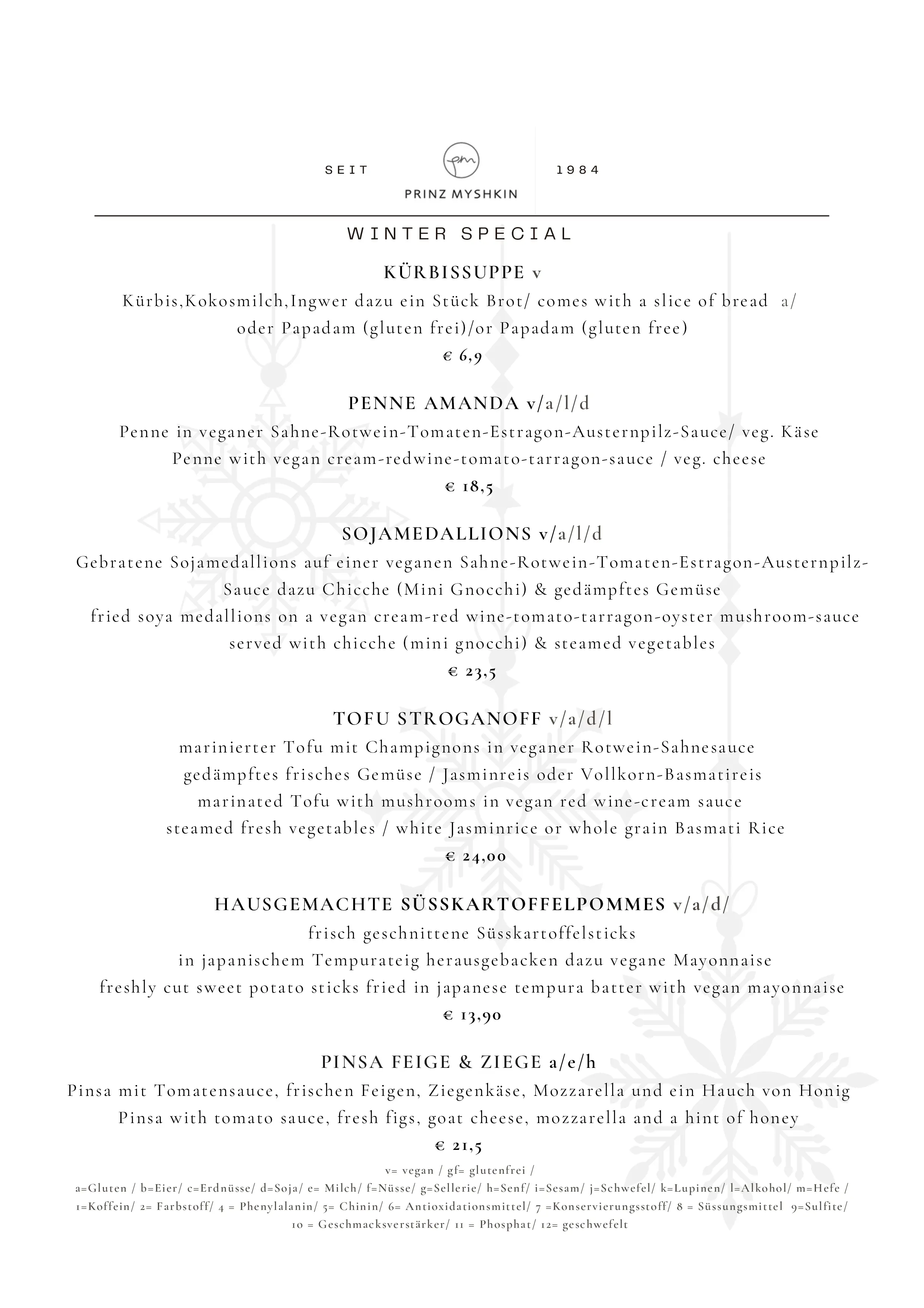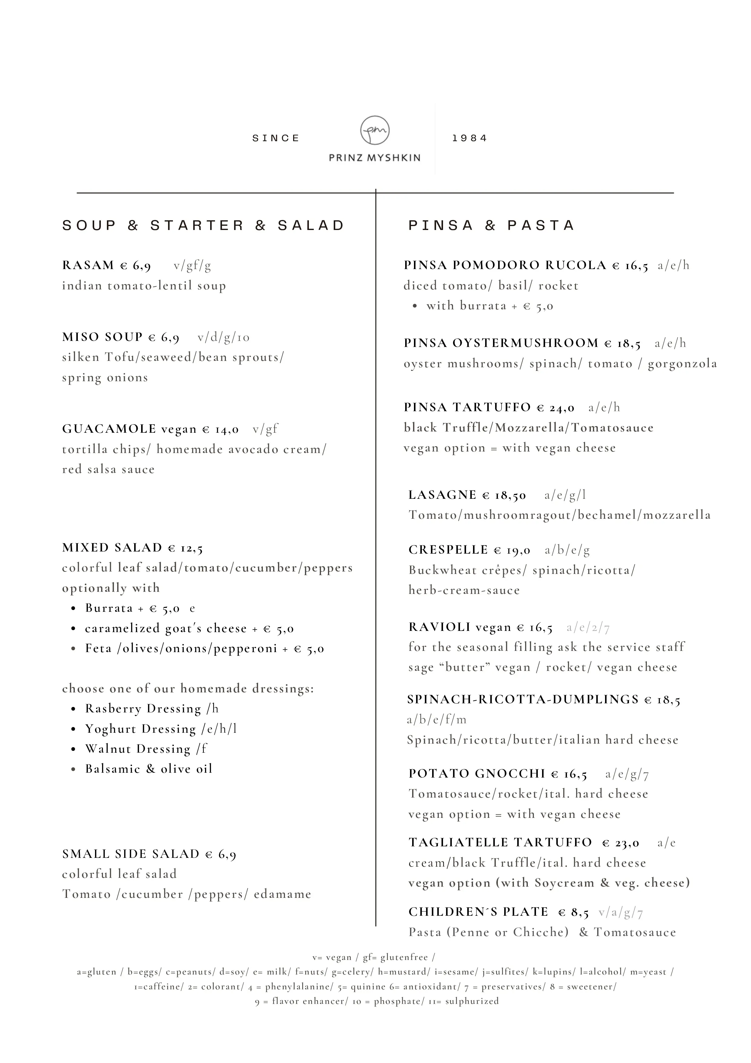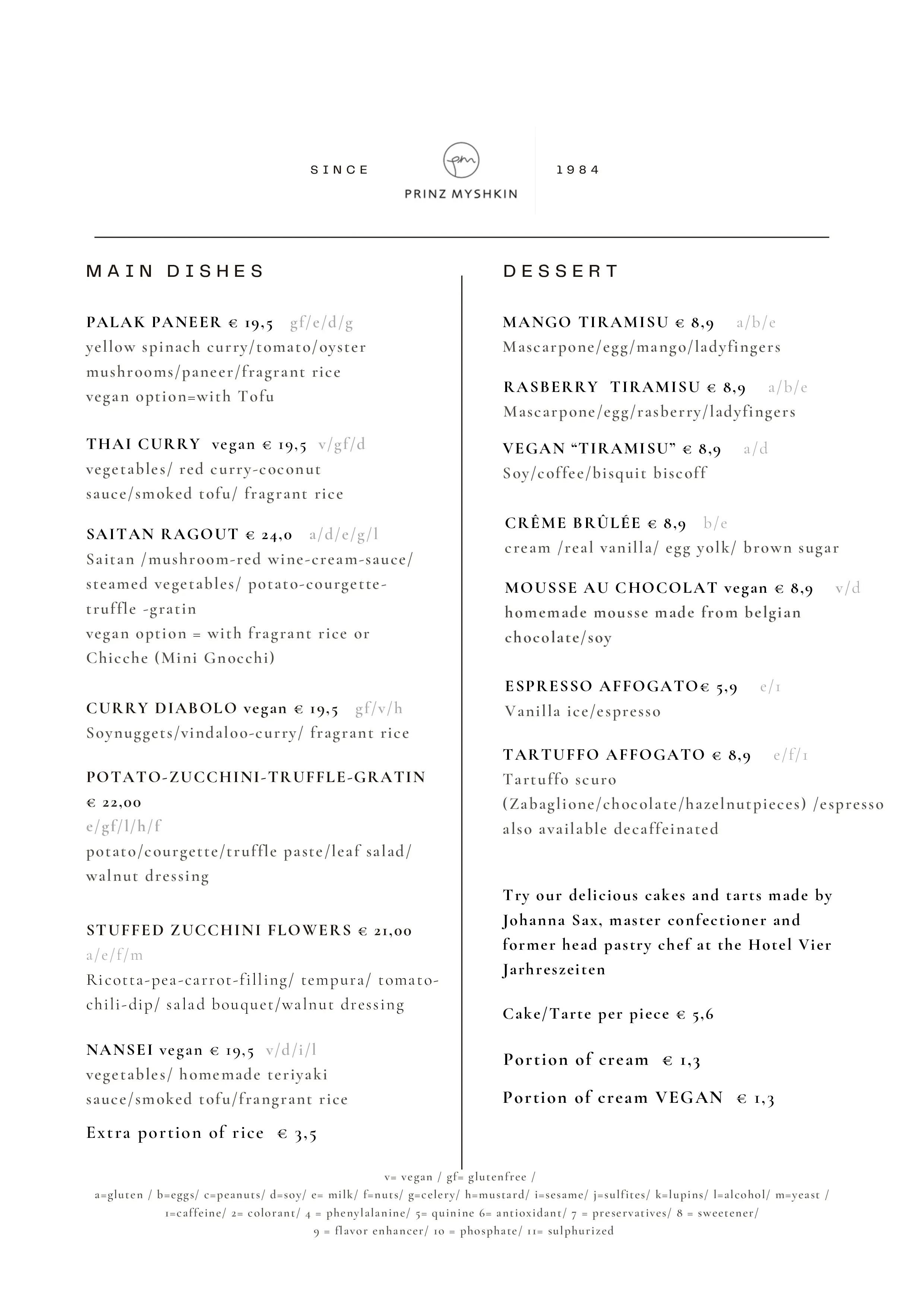 with carrots, cauliflower and oyster mushroom and cream sauce. Choose from white or brown Basmiti rice or Spätzle, a typical noodle specialty from southern Germany 20,90