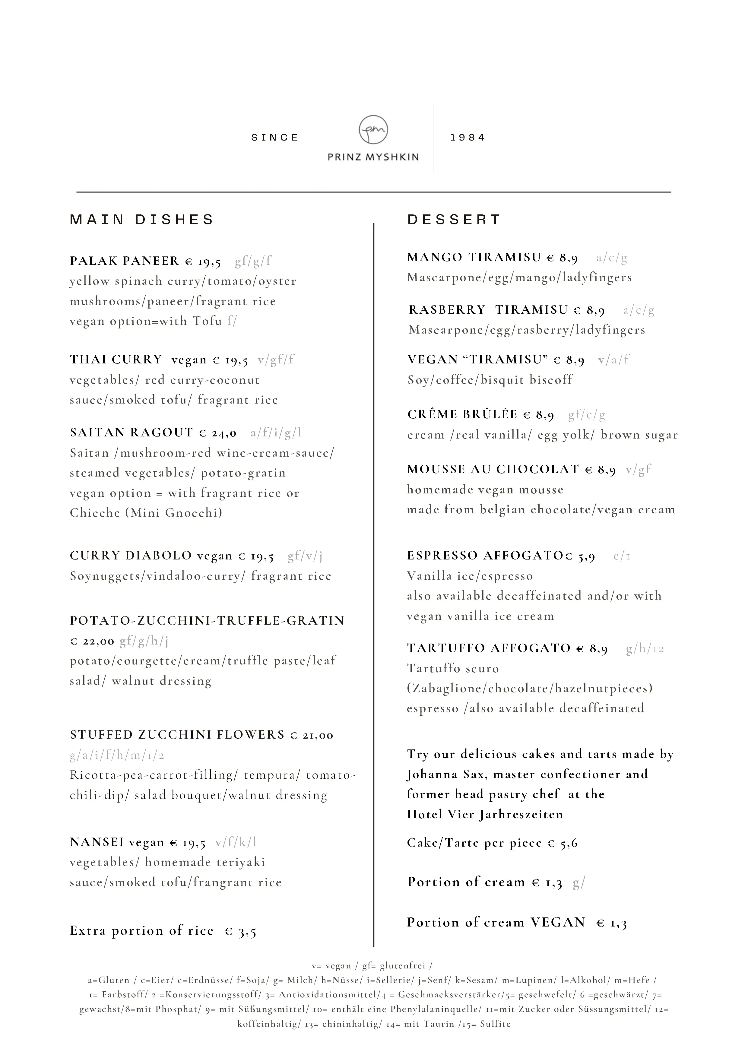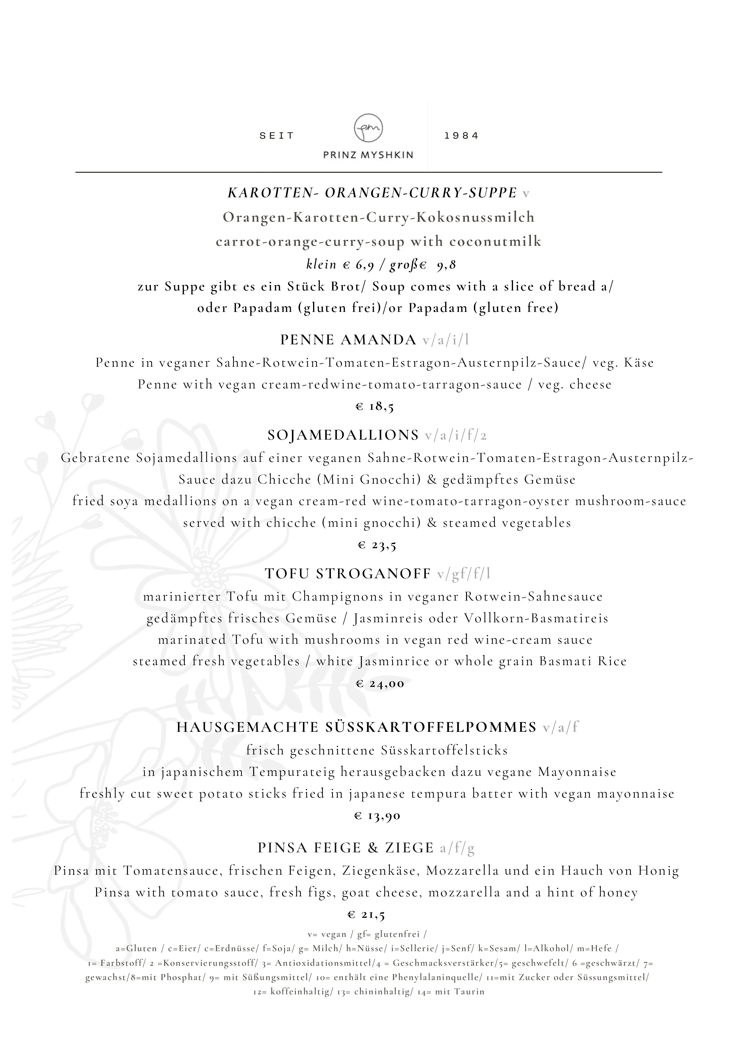 mit Ricotta, Erbsen, Karotten, Ingwer und Cashewnüssen, in einem fruchtigen Rahm aus Kokos-Curry und frisch pürierten Gemüsen. Dazu weißer oder Vollkorn-Basmatireis 17,20